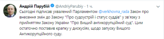 "Сегодня подписал принятый парламентом закон о внесении изменений в закон "О судоустройстве и статусе судей" в связи с принятием закона Украины "О Высшем антикоррупционном суде". Этим окончательно поставил точку в дискуссиях относительно запуска Высшего антикоррупционного суда", - написал Парубий в twitter в среду.