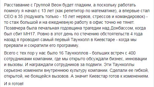"Что будет дальше? Я спокоен за "Киевстар": еще будет много интересных проектов запущено и объявлено в 2018 году и, особенно, в 2019 - но о них теперь пусть говорит новый СЕО. Я передаю ему растущую компанию в очень хорошем состоянии, и уверен, что "Киевстар" продолжит уверенное движение вперед к новым рекордам, по заветам Джима Коллинза в книге "От хорошего к великому", как это было и с "Карлсберг Украина" после нашего расставания", - подчеркнул Чернышов.