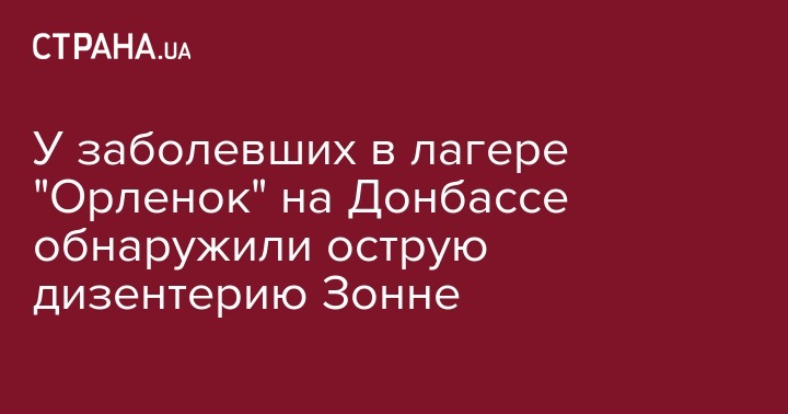 "Сегодня Донецкий областной лабораторный центр МЗ Украины установил причину вспышки острой кишечной инфекции в детском лагере "Орленок" Донецкой области, произошедшей 16-17 июля 2018 года. У 18 из 94 заболевших подтвержден диагноз "острая дизентерия Зонне", возбудителями которой являются шигеллы дизентерии Зонне (Shigella Sonnei)", - говорится в сообщении на сайте Минздрава в четверг.