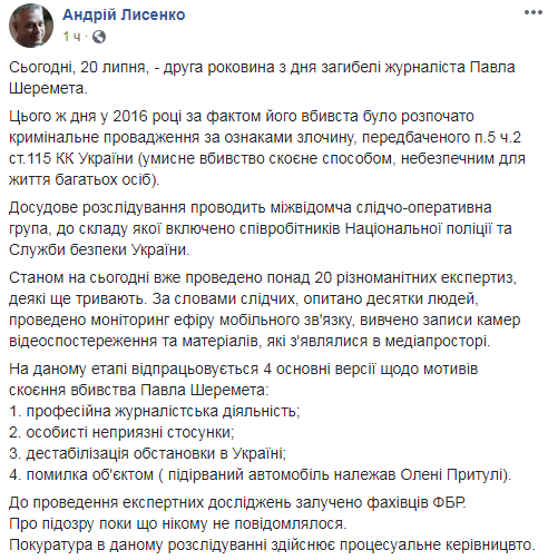 Прокуратурой осуществляется процессуальное руководство расследованием, которое было начато в день его убийства - 20 июля 2016 года. Следствие началось по признакам преступления, предусмотренного п.5 ч.2 ст.115 УК Украины (умышленное убийство совершено способом, опасным для жизни многих лиц).
