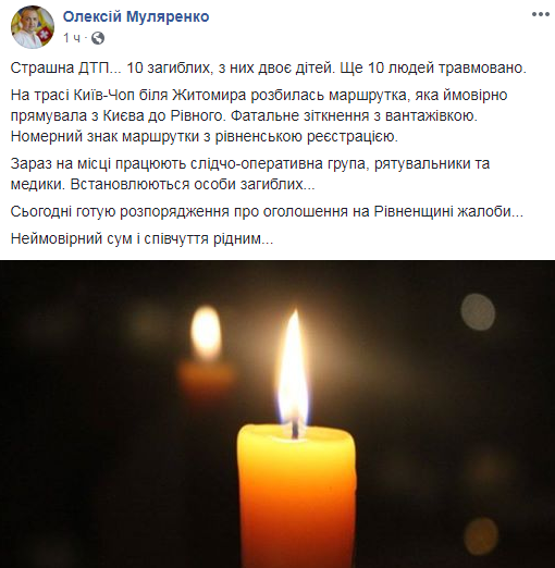 Глава Ровенской ОГА Алексей Муляренко сообщил в Facebook о подписании распоряжения о трехдневном трауре в регионе.