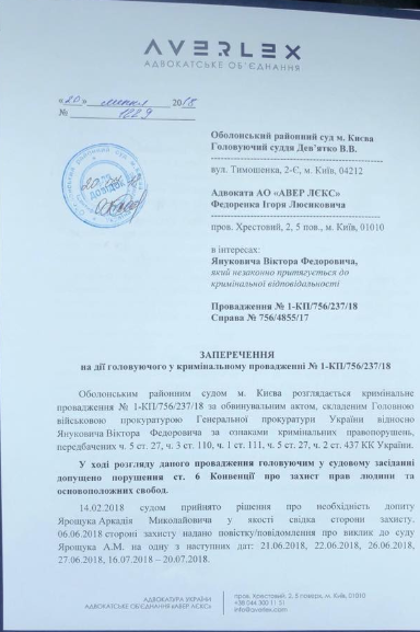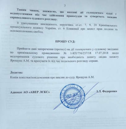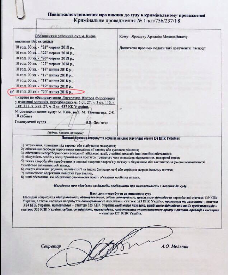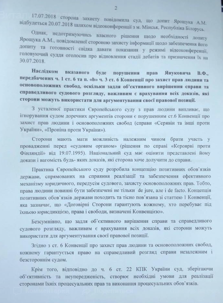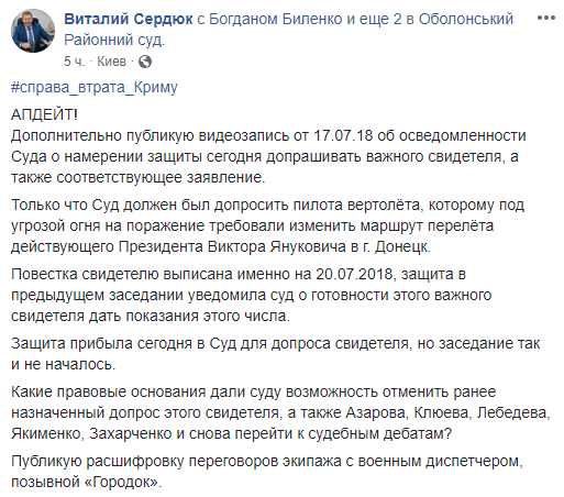 "Только что суд должен был допросить пилота вертолета, которому под угрозой огня на поражение требовали изменить маршрут перелета действующего Президента Виктора Януковича в г. Донецк. Повестка свидетелю выписана именно на 20.07.2018, защита в предыдущем заседании уведомила суд о готовности этого важного свидетеля дать показания этого числа. Защита прибыла сегодня в суд для допроса свидетеля, но заседание так и не началось", - написал он в Facebook.
