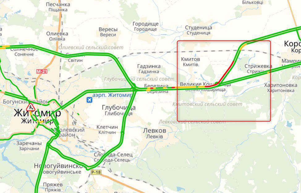 На подъезде к Житомиру при съезде с окружной со стороны Коростышева все еще стоит автомобильное движения, проезд затруднен в сторону Житомира.