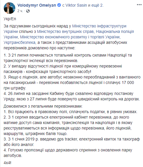 Министр напомнил, что в пятницу днем в Министерстве инфраструктуры состоялись совещания с участием представителей МВД, Нацполиции, Министерство экономического развития и торговли, Госслужбы по безопасности на транспорте, а также представителей ассоциаций автобусных перевозчиков.