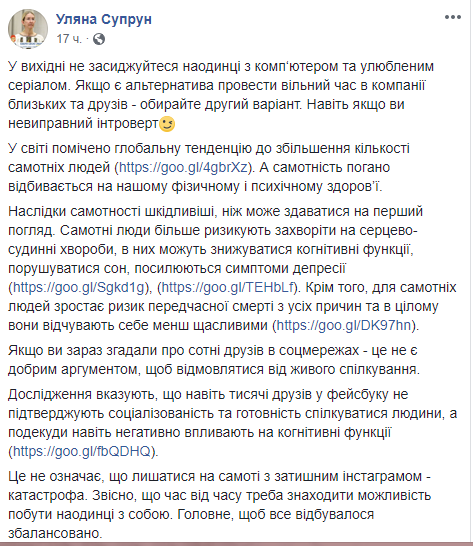 "Если вы сейчас вспомнили о сотни друзьях в соцсетях - это не является хорошим аргументом, чтобы отказываться от живого общения. Исследования указывают, что даже тысячи друзей в Facebook не подтверждают социализованость и готовность человека общаться, а иногда даже негативно влияют на когнитивные функции. Это не означает, что оставаться наедине с уютным Instagram - катастрофа. Естественно, что время от времени надо находить возможность побыть наедине с собой. Главное, чтобы все происходило сбалансировано", - рассказывает Супрун.