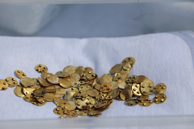 "В процессе раскопок захоронения под названием "Елеке-2" было найдено более 3 тысяч золотых изделий. Эти находки датируются 8-7 веками до нашей эры. Среди них есть уникальные вещи, которых больше нет ни в одном могильнике. Например, женские серьги-колокольчики, пластины с четырьмя заклепками, женское ожерелье с драгоценными камнями. Также среди них имеются снаряжения из золота для лошадей", - рассказали археологи.