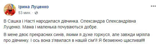"У Саши и Насти родилась девочка. Александра Александровна Луценко. Мама и малышка чувствуют себя хорошо", - сообщила нардеп, которая обрадовалась, что наконец-то в ее семье появилась девочка.