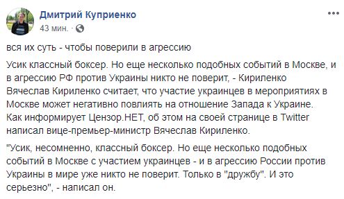 "Усик, несомненно, классный боксер. Но еще несколько подобных событий в Москве с участием украинцев, и в агрессию России против Украины в мире уже никто не поверит. Только в "дружбу". И это серьезно", - заявил Кириленко.