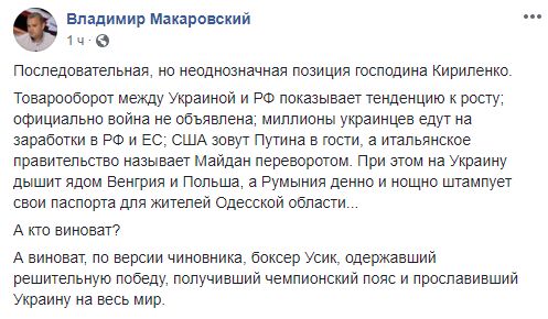 А кто виноват? А виноват, по версии чиновника, боксер Усик, одержавший решительную победу, получивший чемпионский пояс и прославивший Украину на весь мир".