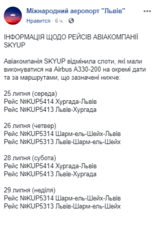 Украинский лоукостер SkyUp отменил часть рейсов из Египта до Львова и в обратном направлении. Об этом сообщает пресс-служба Львовского аэропорта.