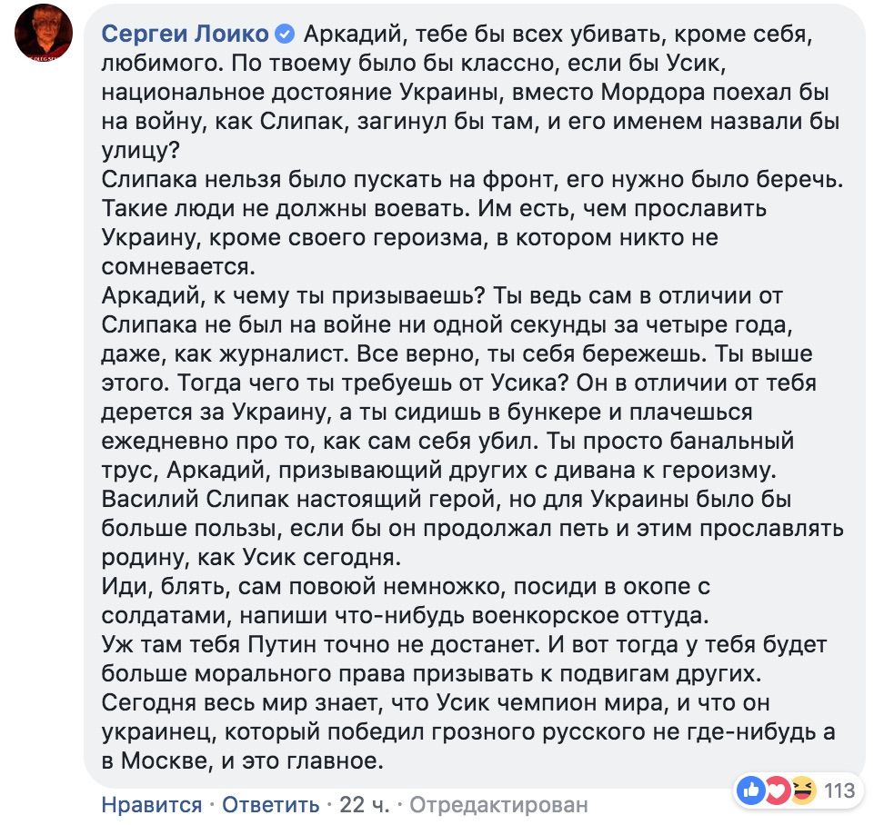Такие размышления возмутили Лойко, который назвал Бабченко банальным трусом, призывающим других к героизму и что он за 4 года ни разу не был на войне. По мнению Лойко, такие люди как Усик и Слипак нужны Украине живыми и подобные таланты нельзя отпускать на войну.