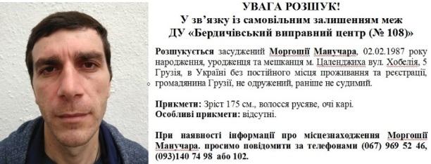 Ночью 24 июля в Бердичевское отделение полиции сообщили о побеге Моргошии Манучара. Заключенный отбывал наказание за разбой (ст. 287 УК Украины). Мужчина сбежал с территории исправительного центра. Подробности побега не разглашаются.