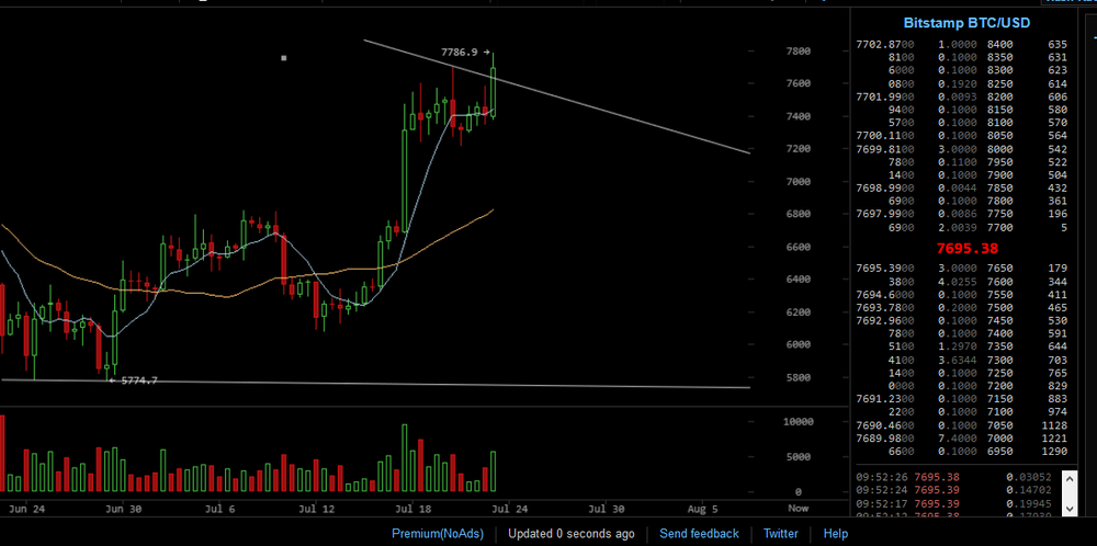 В понедельник он торговался в районе $7691,9, что на 2,3% превышает уровень на закрытие предыдущего дня. А сегодня уже достиг $8000.