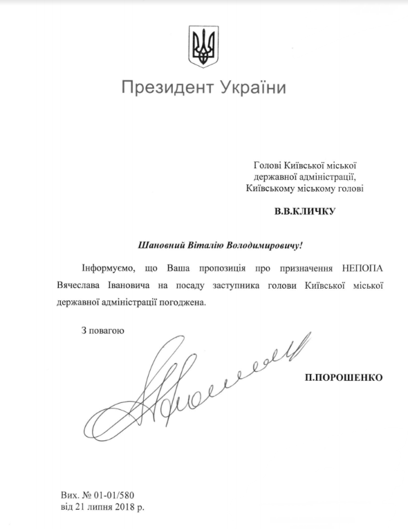 Нового зама для Кличко согласовал президент Петр Порошенко. Документ с одобрением кандидатуры Непопа оказался в распоряжении "Страны".