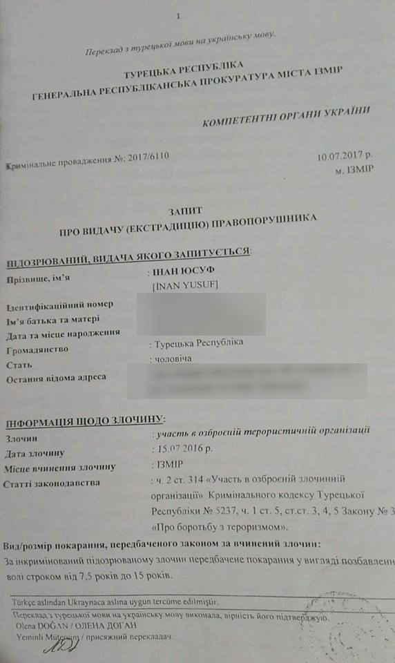 Согласно имеющейся информации, 12 июля гражданина Турции Юсуфа Инана, у которого была удостоверение на постоянное проживание в Украине, задержали представители СБУ. 18 июля Национальный союз журналистов Украины сообщила о его экстрадиции.