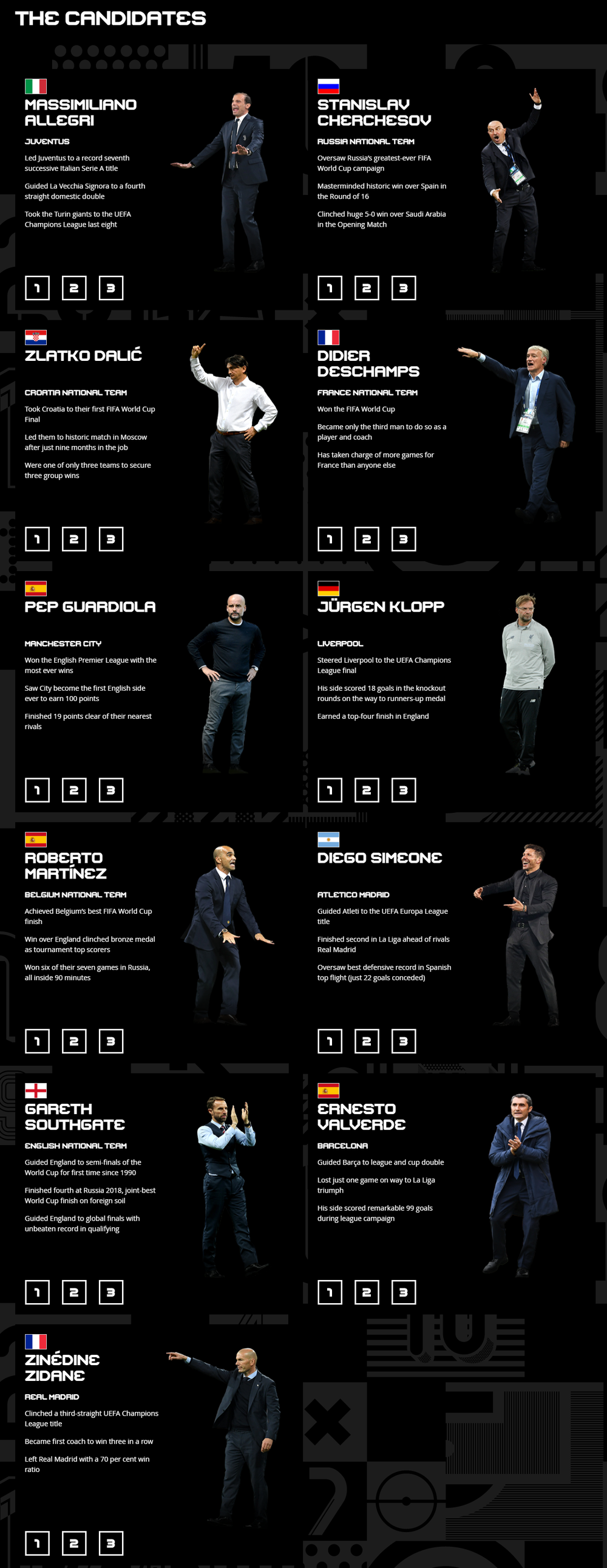 Здесь также опубликован список номинантов на звание тренера года ФИФА. В их числе - тренер сборной Франции Дидье Дешам, тренер хорватской сборной Златко Далич, тренер сборной Англии Гарет Саутгейт, тренер "Ювентуса" Массимилиано Аллегри, тренер "Манчестер Сити" Хосеп Гвардиола, тренер "Ливерпуля" Юрген Клопп, тренер сборной Бельгии Роберто Мартинес, тренер "Атлетико" Диего Симеоне, тренер "Барселоны" Эрнесто Вальверде, тренер "Реала" в сезоне 2017/2018 Зинедин Зидан, тренер российской сборной Станислав Черчесов.