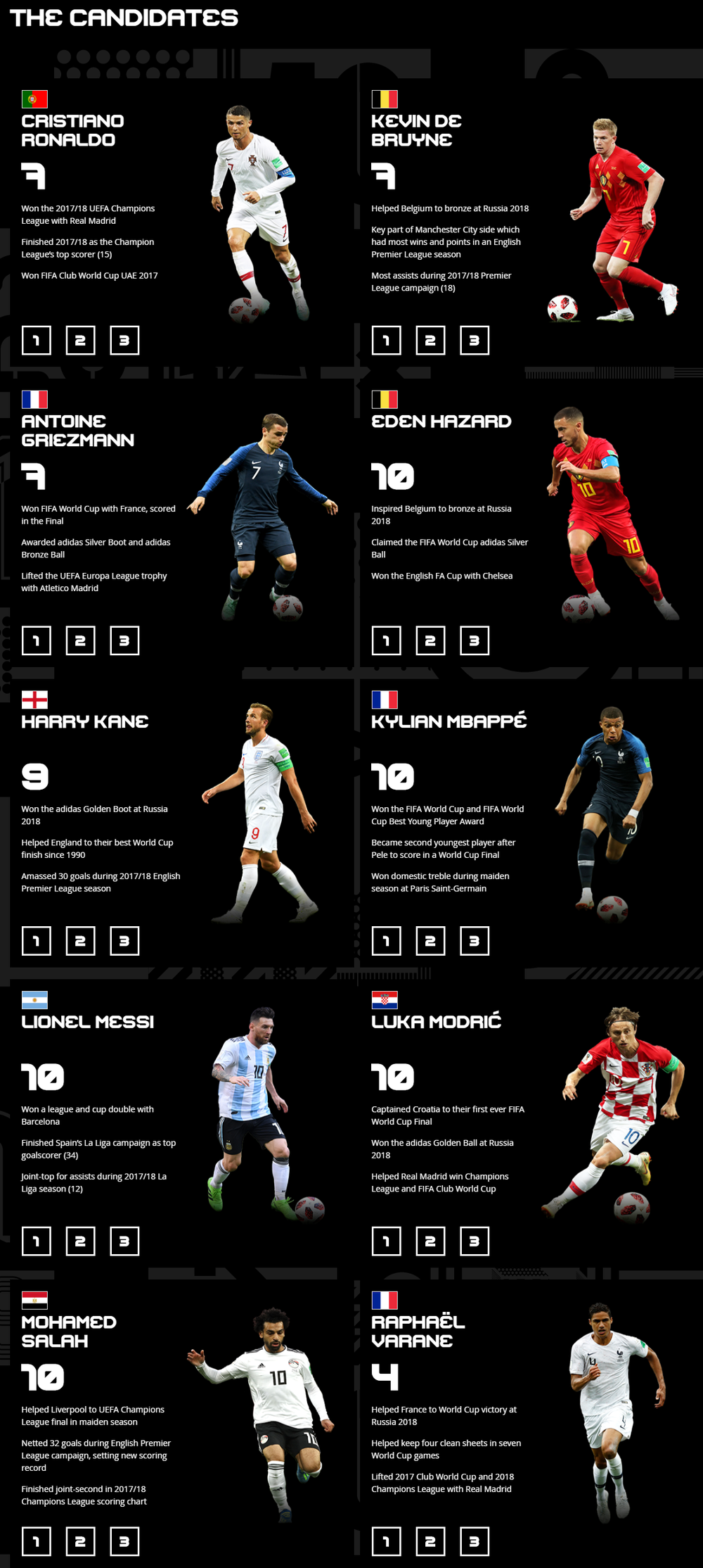 В числе футболистов - капитан французской сборной Антуан Гризманн, игроки сборной Франции Киллиан Мбаппе и Рафаэль Варан, капитан сборной Португалии Криштиану Роналду, капитан сборной Аргентины Лионель Месси, капитан сборной Хорватии Лука Модрич, капитан сборной Англии Гарри Кейн, капитан сборной Египта Мохаммед Салах, бельгийские полузащитники Эден Азар и Кевин Де Брюйне.