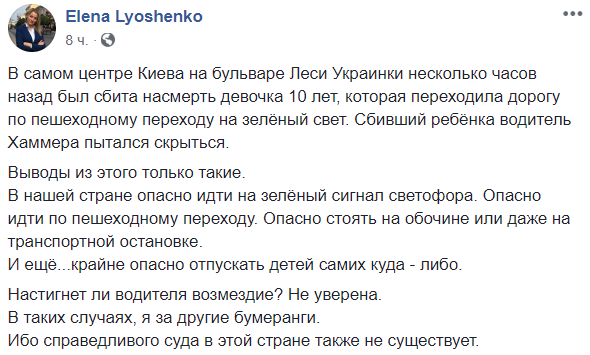 Настигнет ли водителя возмездие? Не уверена. В таких случаях я за другие бумеранги. Ибо справедливого суда в этой стране также не существует", – пишет адвокат Елена Лешенко.