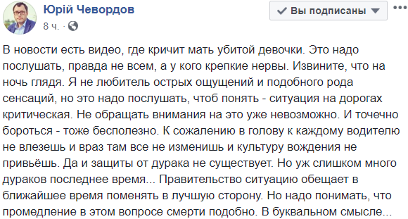 "В новости есть видео, где кричит мать убитой девочки. Это надо послушать, правда, не всем, а у кого крепкие нервы. Извините, что на ночь глядя. Я не любитель острых ощущений и подобного рода сенсаций, но это надо послушать, чтоб понять – ситуация на дорогах критическая. Не обращать внимания на это уже невозможно. И точечно бороться – тоже бесполезно. К сожалению, в голову к каждому водителю не влезешь и враз там все не изменишь и культуру вождения не привьешь. Да и защиты от дурака не существует. Но уж слишком много дураков последнее время... Правительство ситуацию обещает в ближайшее время поменять в лучшую сторону. Но надо понимать, что промедление в этом вопросе смерти подобно. В буквальном смысле...".