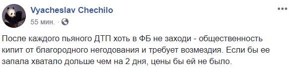 "После каждого пьяного ДТП хоть в ФБ не заходи – общественность кипит от благородного негодования и требует возмездия. Если бы ее запала хватало дольше чем на 2 дня, цены бы ей не было".