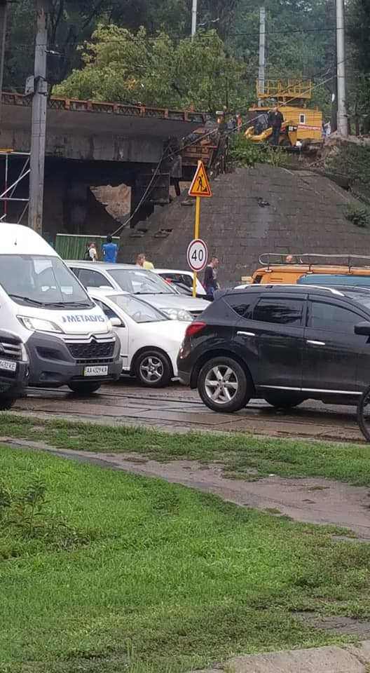 В Киеве после дождя над улицей Кирилловской  по улице Елены Телиги обвалилась часть Кирилловского путепровода, где еще с весны продолжаются ремонтные работы.
