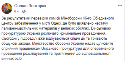 "По результатам проверки комиссии Минобороны 46-го Объединенного центра обеспечения в городе Одессе, где была обнаружена недостача ГСМ в больших объемах, Военной прокуратурой Украины начато уголовное производство, - написал он в Facebook. - Сегодня в подразделении уже происходят следственные действия и продолжаются обыски".