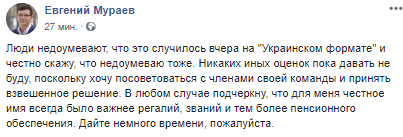 "Люди недоумевают, что это случилось вчера на "Украинском формате" и честно скажу, что недоумеваю тоже. Никаких иных оценок пока давать не буду, поскольку хочу посоветоваться с членами своей команды и принять взвешенное решение. В любом случае подчеркну, что для меня честное имя всегда было важнее регалий, званий и тем более пенсионного обеспечения. Дайте немного времени, пожалуйста", - написал в соцсети Мураев.