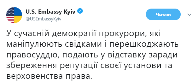 "В современной демократии прокуроры, которые манипулируют свидетелями и препятствуют правосудию, подают в отставку ради сохранения репутации своего учреждения и верховенства права", - туманно, но вполне понятно написали в Twitter диппредставительства.