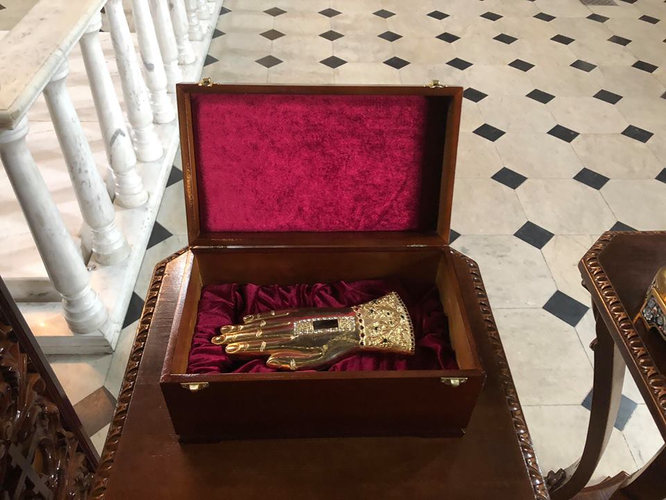 - мощи (правая рука) святого Георгия Победоносца, которые всегда находятся на Афоне.