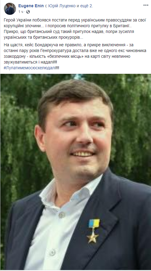 К счастью, кейс Бондаркуча не правило, а досадное исключение - за последние пару лет Генпрокуратура достала уже не одного экс чиновника заграницей - количество "безопасных мест" на карте мира постоянно сужается и в дальнейшем !!!", - написал в социальной сети заместитель генерального прокурора Украины.