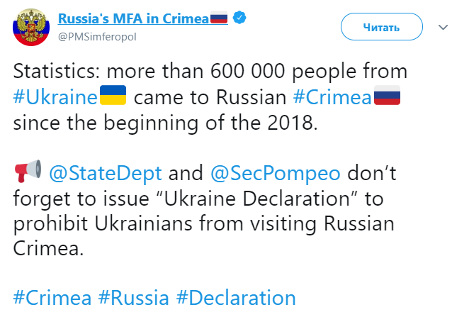 "Государственный департамент и государственный секретарь Помпео, не забудьте опубликовать "Декларацию относительно Украины", которая запретит украинцам посещать российский Крым", - заявили во внешнеполитическом ведомстве России.