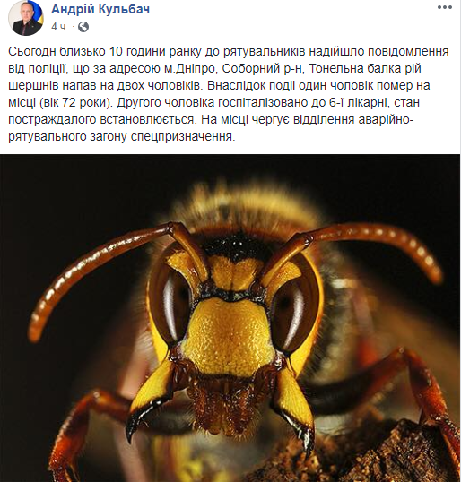 Сегодня, 28 июля, в Днепре в результате нападения роя шершней погиб 72-летний мужчина, еще один был госпитализирован. Об этом сообщил начальник Главного управления ГосЧС в Днепропетровской области Андрей Кульбач на своей странице в Facebook.