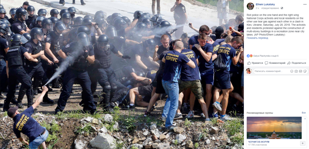 Сегодня, 28 июля, в Киеве на Осокорках произошли столкновения возле стройплощадки, на месте которой требуют возвести экопарк. Полиция задержала двух человек. Фото с места событий опубликовал украинский фотокорреспондент Ефрем Лукацкий на своей странице в Facebook.