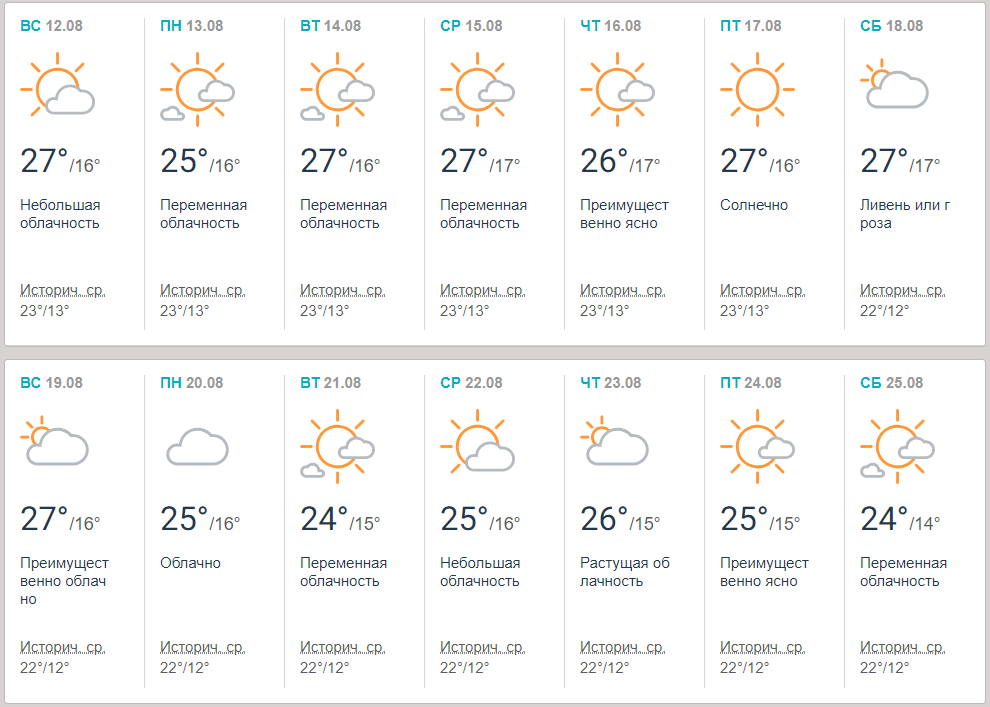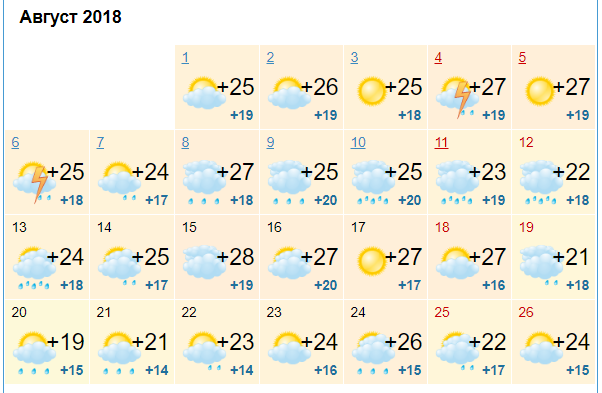 По версии сайта Gismeteo, в последний месяц лета температура воздуха днем составит 19-28 градусов. Ночью столбики термометра упадут до 14-20 градусов. Весь месяц дневная температура будет практически одинаково комфортной и теплой. Однако к сентябрю ночи станут более холодными, но это не удивительно, ведь приближается осень. Дождливых дней, по прогнозам синоптиков, будет гораздо меньше, чем в июле.