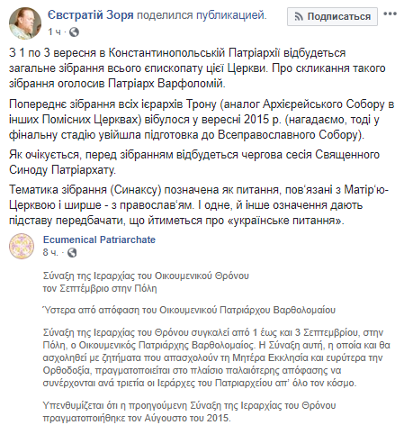 "С 1 по 3 сентября в Константинопольской Патриархии состоится общее собрание всего епископата этой Церкви. О созыве такого собрания объявил Патриарх Варфоломей", - написал он.