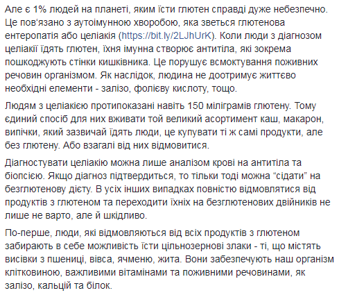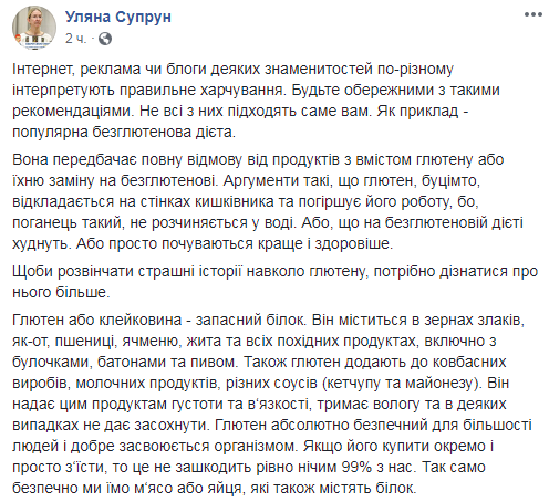 Исполняющая обязанности министра здравоохранения Украины Ульяна Супрун вновь предостерегла читателей своего Facebook. На этот раз – от популярной безглютеновой диеты.