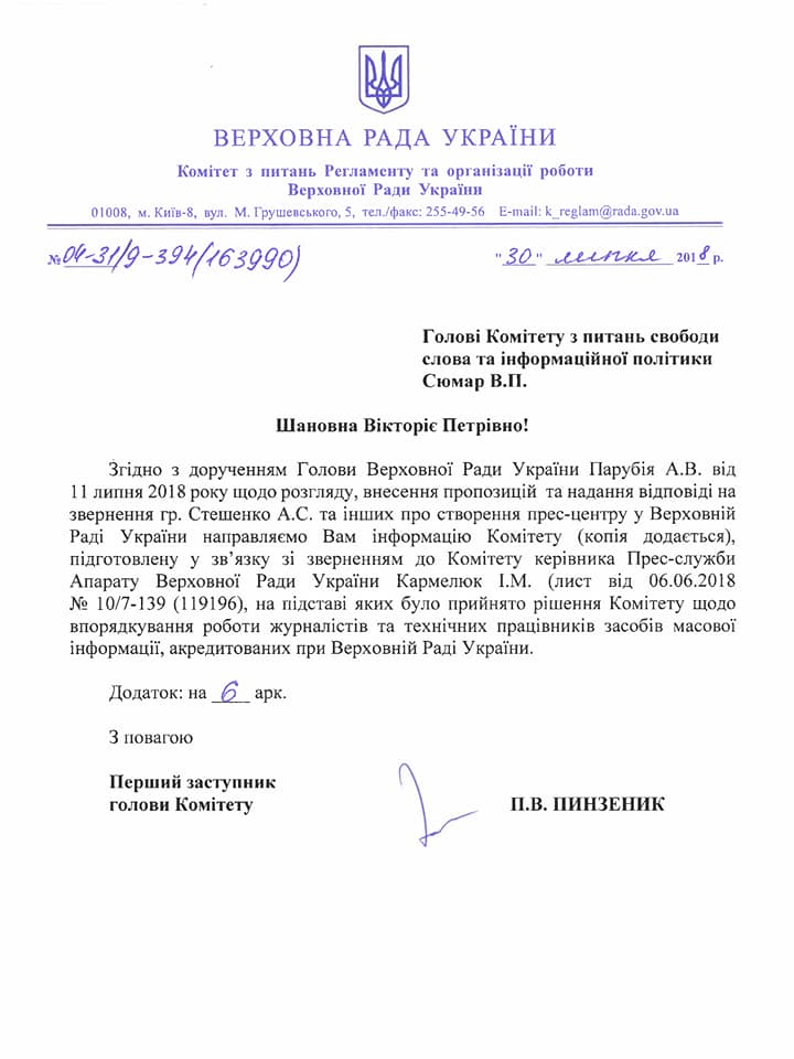 Об этом сказано в письме Регламентного комитета на призыв Комитета по вопросам свободы слова не допустить ограничения работы журналистов в Раде, пишет на своей странице в Facebook Ольга Червакова, первый заместитель председателя Комитета по вопросам свободы слова и информационной политики в ВР.
