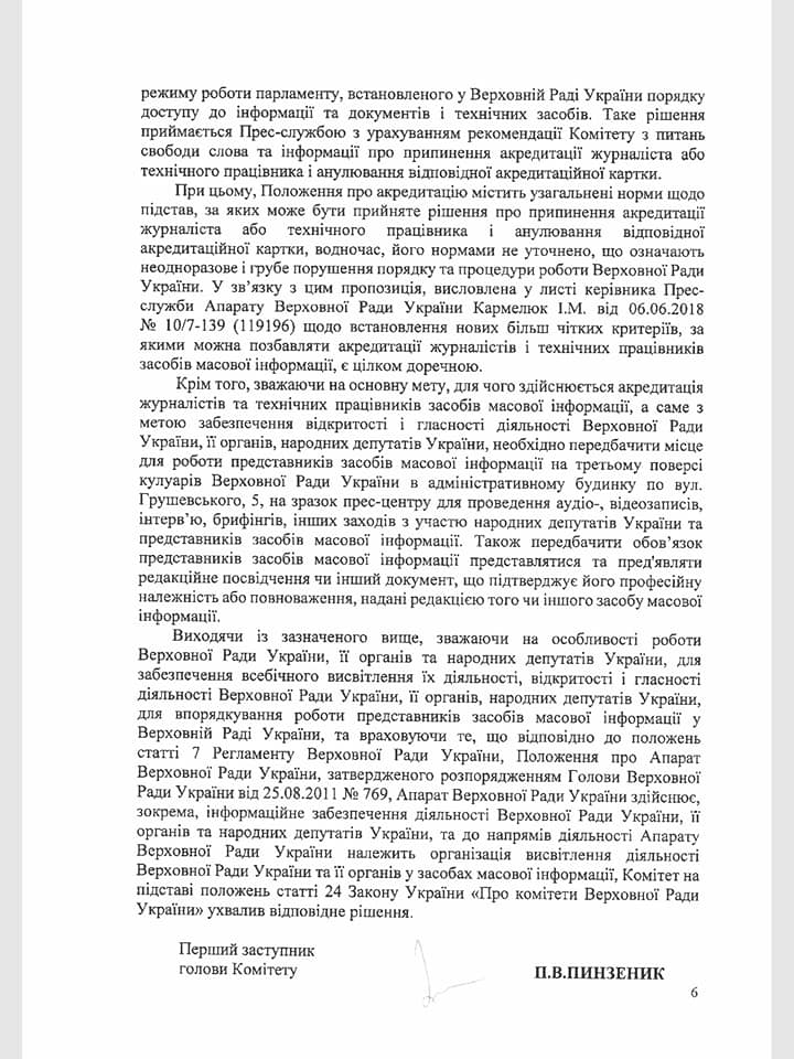 Она отмечает, что комитет Пинзеника согласился, что работа СМИ, аккредитованных в Верховной Радуюсь должна быть открытой. Однако, трактует открытость экзотическим способом: "Съемка, которая проводится открыто, должно быть не скрытой (тайной) для лица, в отношении которого осуществляется эта съемка. Предполагается съемка лица без его согласия, если она проводится, в частности, открыто в публичных местах, пока лицо, которую снимают на фото-, кино-, теле - или видеопленку не выскажет свое возражение относительно этого, в таком случае съемка должна быть прекращена, а моменты записи с участием этого лица изъяты".