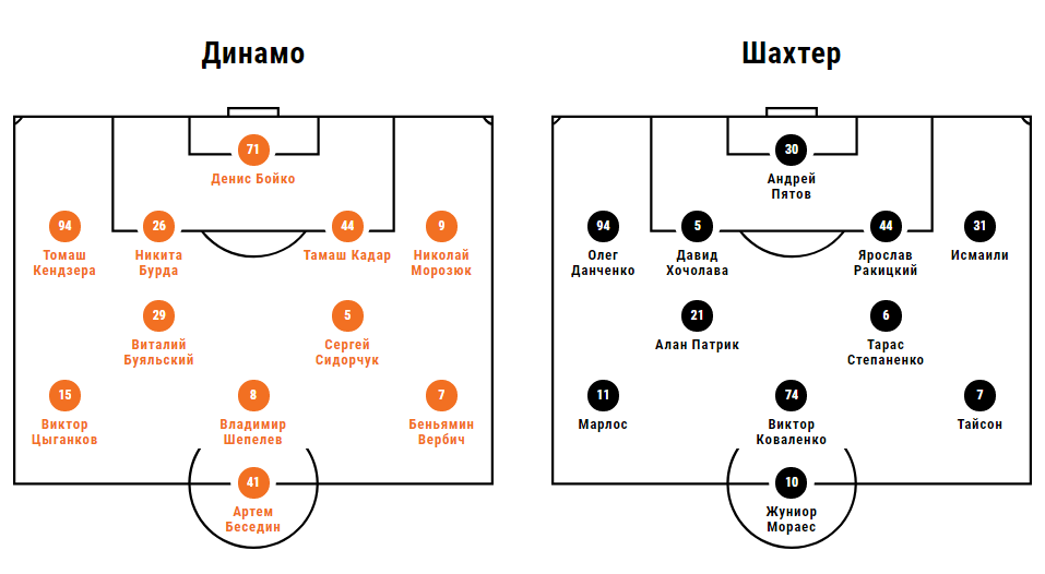 Шахтер: Пятов - защита Данченко, Хочолава, Ракицкий, Исмаили - полузащита - Степаненко, Патрик, Марлос, Коваленко, Тайсон - нападение Мораес.