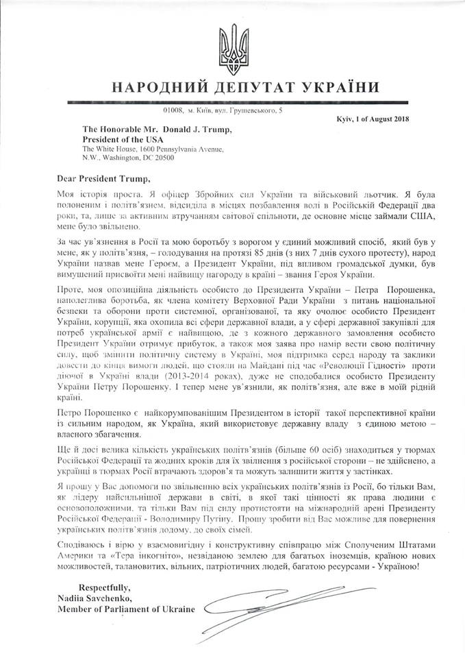 "Я прошу у вас помощи по освобождению всех украинских политзаключенных из России, потому что только вам, как лидеру самого сильного государства в мире ... только вам под силу противостоять на международной арене президенту России Владимиру Путину. Прошу сделать все от вас возможное для возвращения украинских политзаключенных домой, к своим семьям", - написала Савченко Трампу.