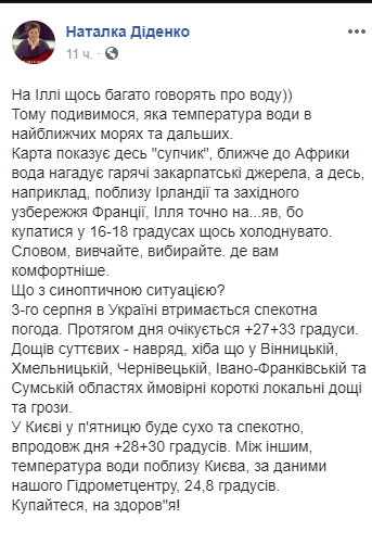 "В течение дня ожидается + 27... + 33 градуса. Дождей существенных - вряд ли,  разве что в Винницкой, Хмельницкой, Черновицкой, Ивано-Франковской и Сумской областях вероятные короткие локальные дожди и грозы. В Киеве в пятницу будет сухо и жарко, в течение дня + 28 ... + 30 градусов. Между прочим, температура воды возле Киева, по данным нашего Гидрометцентра, 24,8 градусов,"  -написала она.