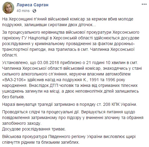 В Херсонской области военный комиссар насмерть сбил молодую пару. Об этом пишет пресс-секретарь прокурора Лариса Сарган на своей странице в Facebook.