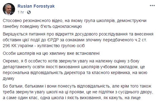 "Кто-то распространяет информацию, что это 69 школа, это не так, не распространяйте фейк", - написал Форостяк.