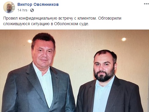 "Провел конфиденциальную встречу с клиентом. Обговорили сложившуюся ситуацию в Оболонском суде Киева", - написал Овсянников, опубликовав также совместную с Януковичем фотографию.