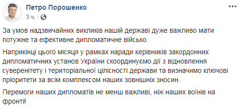 "Победы наших дипломатов не менее важны, чем наших воинов на фронте!", - добавил президент.