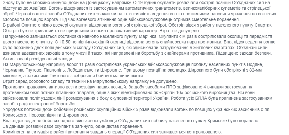 Боевики вели прицельный огонь из гранатометов, крупнокалиберных пулеметов и стрелкового оружия, а на отдельных направлениях с вооружения БМП. Огонь велся по защитникам, Крымского, Новозвановки, Троицкого, Новолуганского, Марьинки, Авдеевки, Новотроицкого, Опытно, Чермалыка, Гнутово, Лебединского, Павлополя, Водяного и Широкино. Наряду с этим, противник обстрелял позиции ВСУ у Широкино из 82-мм минометов.