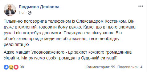 "Только что поговорила по телефону с Александром Костенко. Он очень устал, говорить ему трудно. Говорит, что у него сломана рука и он нуждается в помощи. Поблагодарил за заботу", - написала она в своей странице в соцсети Facebook в понедельник днем.