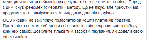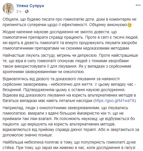"Ни одно должное научное исследование не смогло доказать, что гомеопатические препараты действительно работают. Однако в мире есть тысячи людей, которые верят в действенность гомеопатии и упорно продолжают лечить болезни гомеопатическими препаратами или похожими недоказуемыми методами. Чаще всего лечат простуду, мигрень или депрессию. Однако самое страшное, что вера в силу гомеопатии побуждает людей с тяжелыми болезнями использовать ее для лечения. Как в случаях с серьезными хроническими заболеваниями или онкологией," - предостерегла Супрун.