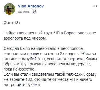 "Сегодня было найдено тело в лесополосе, которое там провисело около двух недель. Убийство это или самоубийство, установит экспертиза. Каким образом труп оказался повешенным на дереве, пока неизвестно", - говорится в сообщении.