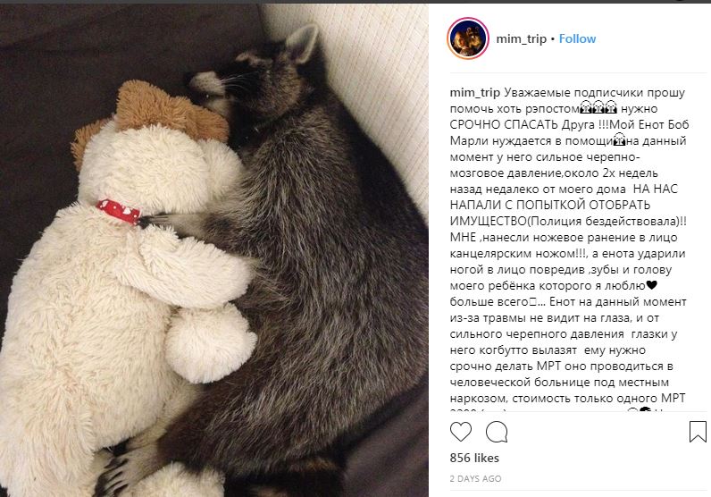 Во время нападения злоумышленники ранили музыканта ножом в лицо, а также нанесли телесные повреждения его домашнему любимцу - еноту Марли. "Уважаемые подписчики прошу помочь хоть репостом. Нужно срочно спасать друга! Мой Енот Боб Марли нуждается в помощи на данный момент у него сильное черепно-мозговое давление", - написал он.